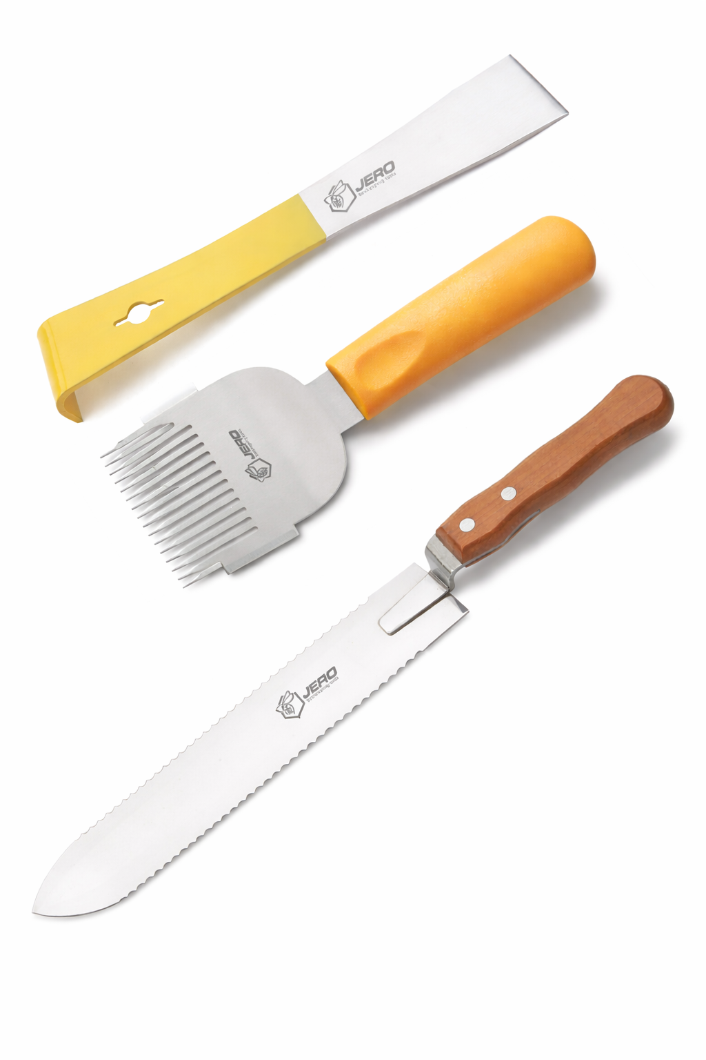 Das JERO Imker Werkzeug-Set vereint drei hochwertige Profi-Werkzeuge für die effiziente Honigernte und die tägliche Arbeit am Bienenstand.
