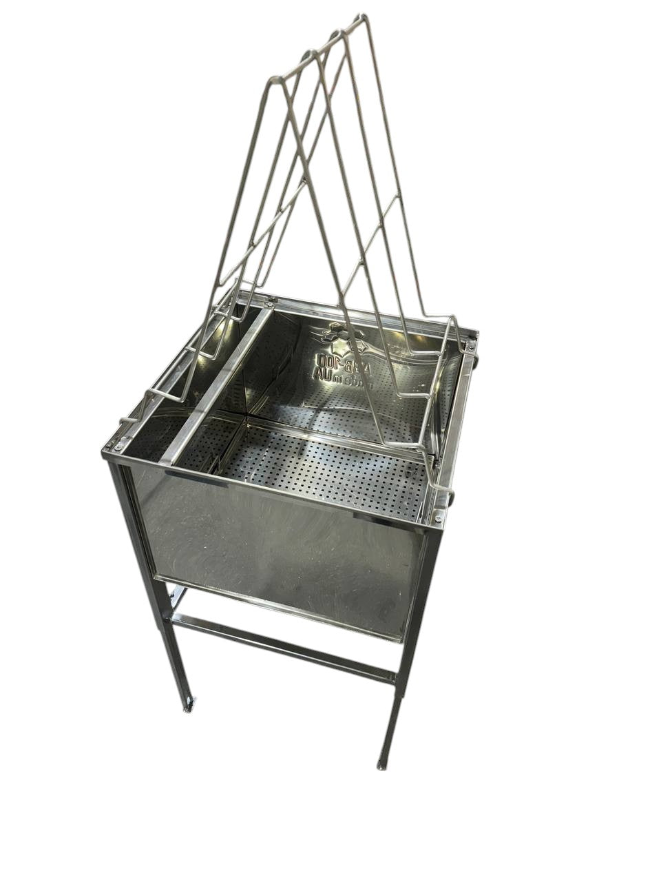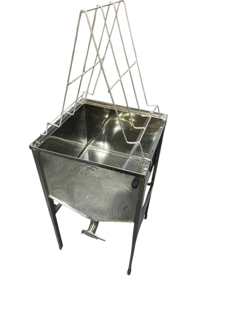 Der Wabenentdeckelungstisch mit 0,5 m Breite ist eine kompakte, professionelle Lösung für das saubere und effiziente Entdeckeln von Honigwaben. Die überarbeitete Version verfügt über klappbare Teleskopbeine sowie eine montierte Edelstahl-Rähmchenhalterung, die eine sichere Fixierung der Rähmchen ermöglicht.